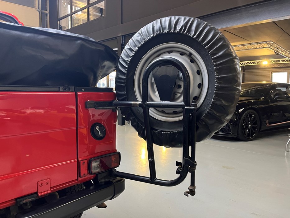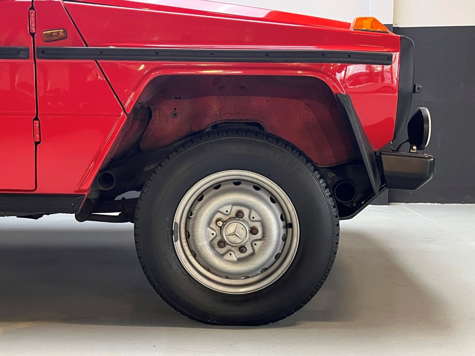 On the rear, the car features the early externally mounted spare wheel, a characteristic detail that adds visual charm and perfectly suits the Geländewagen identity.