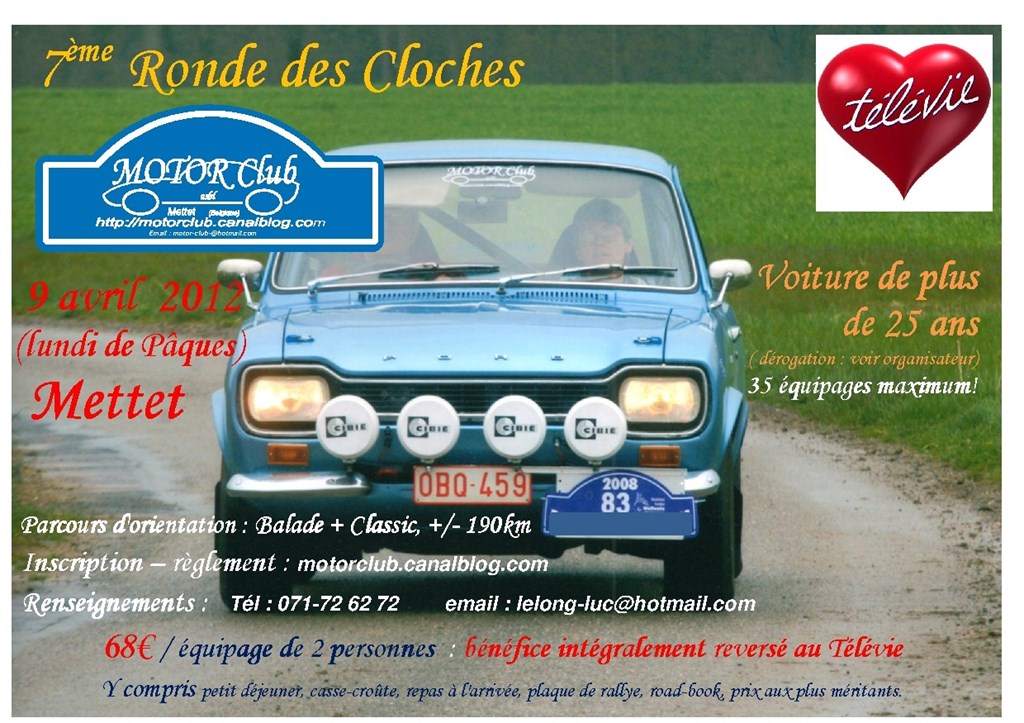 7ème Ronde des Cloches - Télévie : Lundi de Pâques 9 7ème Ronde des Cloches - Télévie : Lundi de Pâques 9 Lundi de Pâques 9 avril : Rallye d'orientation : 2 catégories = balade + classic: +/- 200km : pdj + pique-nique + repas du soir + road-book + plaque rallye = 68 €/équipage de 2 personnes hors boisson. RDV : 8h30 place J. meunier 5640 Mettet : uniquement sur inscription