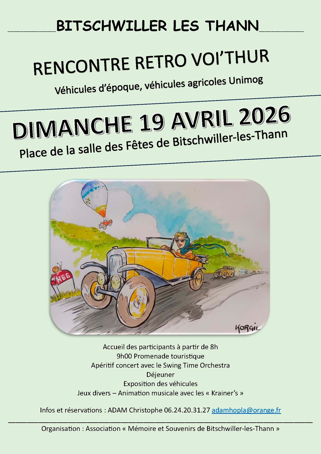 Nous vous accueillerons sur la place de la salle des fêtes de Bitschwiller-lès-Thann à partir de 8h et vous proposerons un petit déjeuner (café, jus de fruit, croissant). Nous vous distribuerons les plaques rallye avant de prendre le départ à 9h pour une petite promenade dans les contrées avoisinantes.